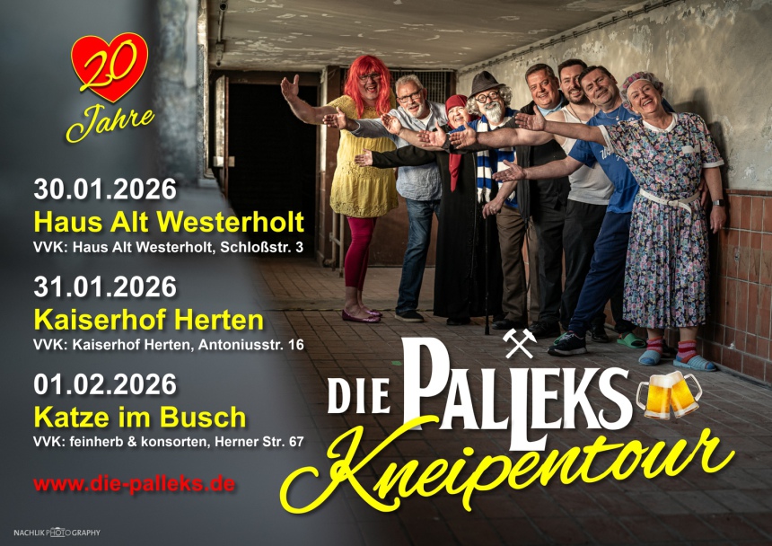 So, Kinnas! Nach den Palleks is vor den Palleks! Am 30.08.2025 sind wir bei der Jubiläumsrevue „50 Jahre Herten & Westerholt/ Bertlich“ auf der Zeche Schlägel & Eisen dabei! Infos aufm Flyer!